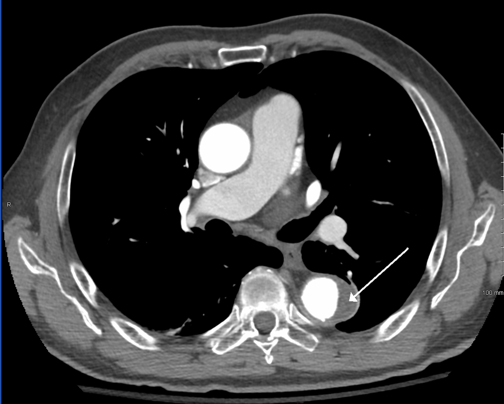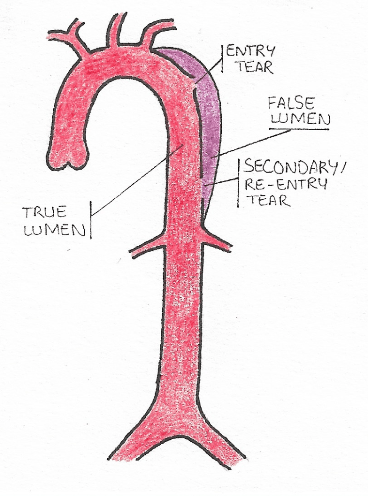 The image below presents what a CT scan looks like for a patient with a type B dissection (author James Heilman, MD): the area outlined by the arrow is the dissection’s false lumen. This new route shrinks up the aorta and decreases the blood supply in the aorta (the white part next to the false lumen, which is quite smaller in comparison to how wide the aortic root is at the center of the image):